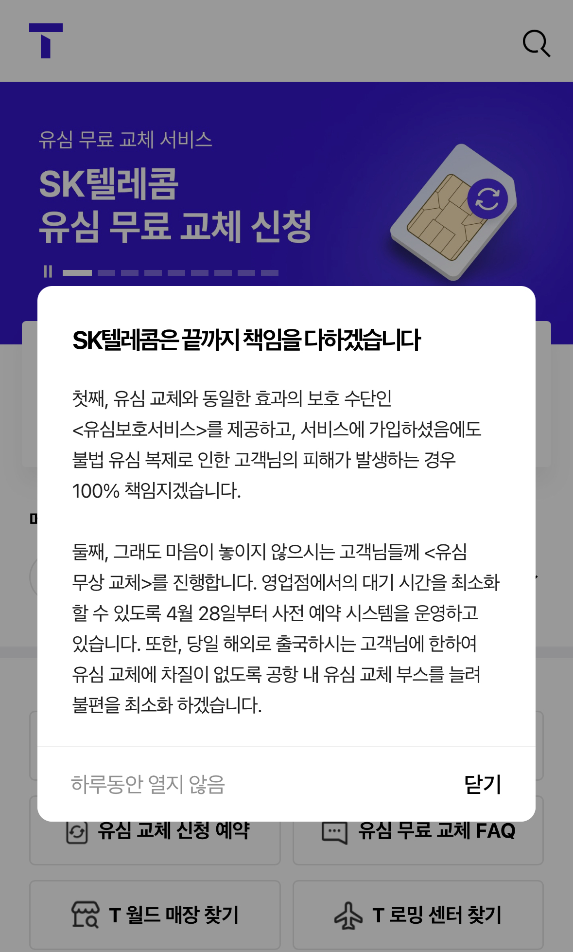 이제는 유심보호서비스 가입 신청만해도 해킹 피해를 100% SKT가 보상해 준다는 내용을 담고 있어요.