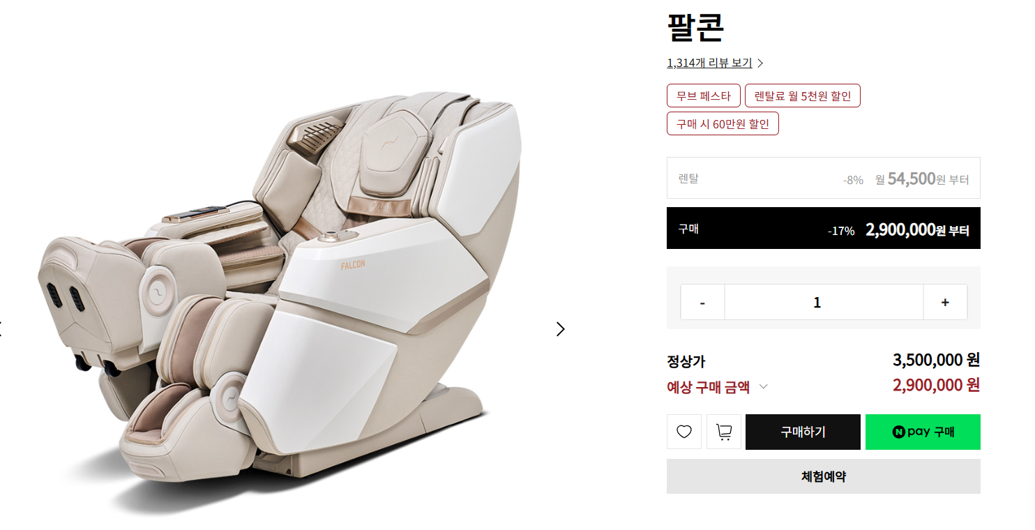 현재 별점 4.8점, 리뷰 501개를 가진 바디프랜드 팔콘 안마의자 + 러그 랜덤발송 방문설치! 지금 쿠팡에서 더 저렴하고 다양한 안마의자 제품들을 확인해보세요.
