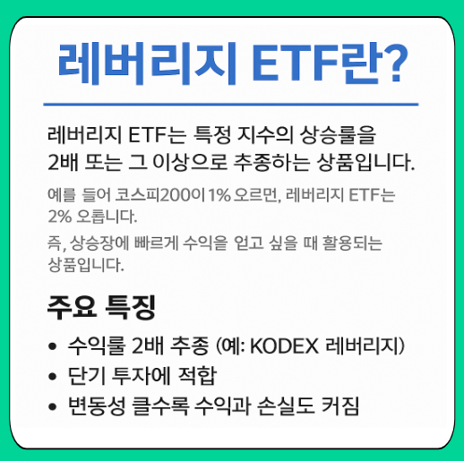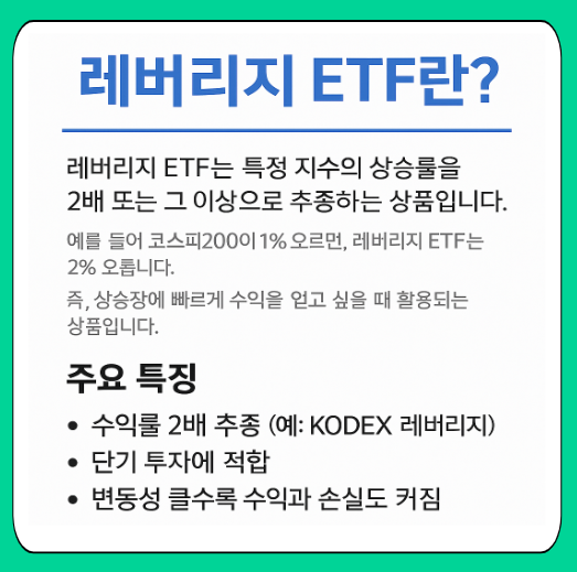 레버리지 ETF는 특정 지수의 상승률을 2배 또는 그 이상으로 추종하는 상품입니다.