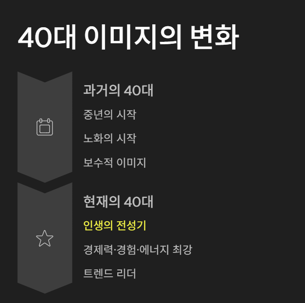 자신의 삶을 능동적으로 개척하는 사람들이 늘어나면서 자연스럽게 “젊은 40대”라는 정체성이 자리 잡았죠.