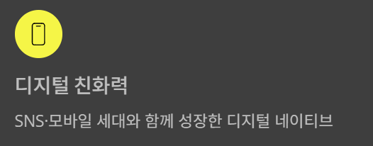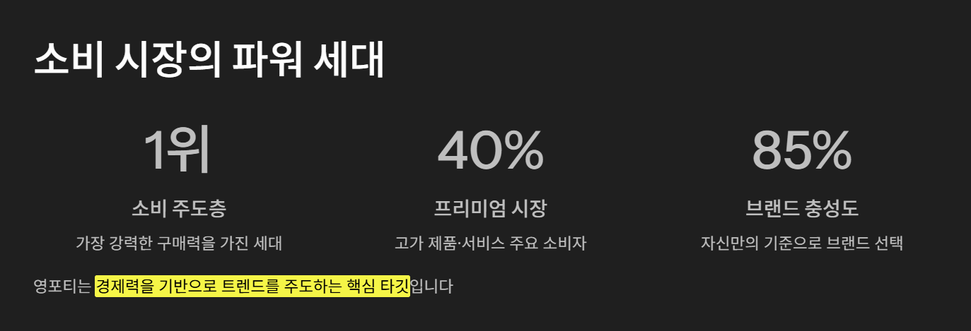- 경제력·트렌드 감각·디지털 친화력까지 갖춘 주요 소비 계층으로서 큰 영향력을 가지는 세대입니다.