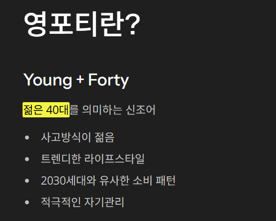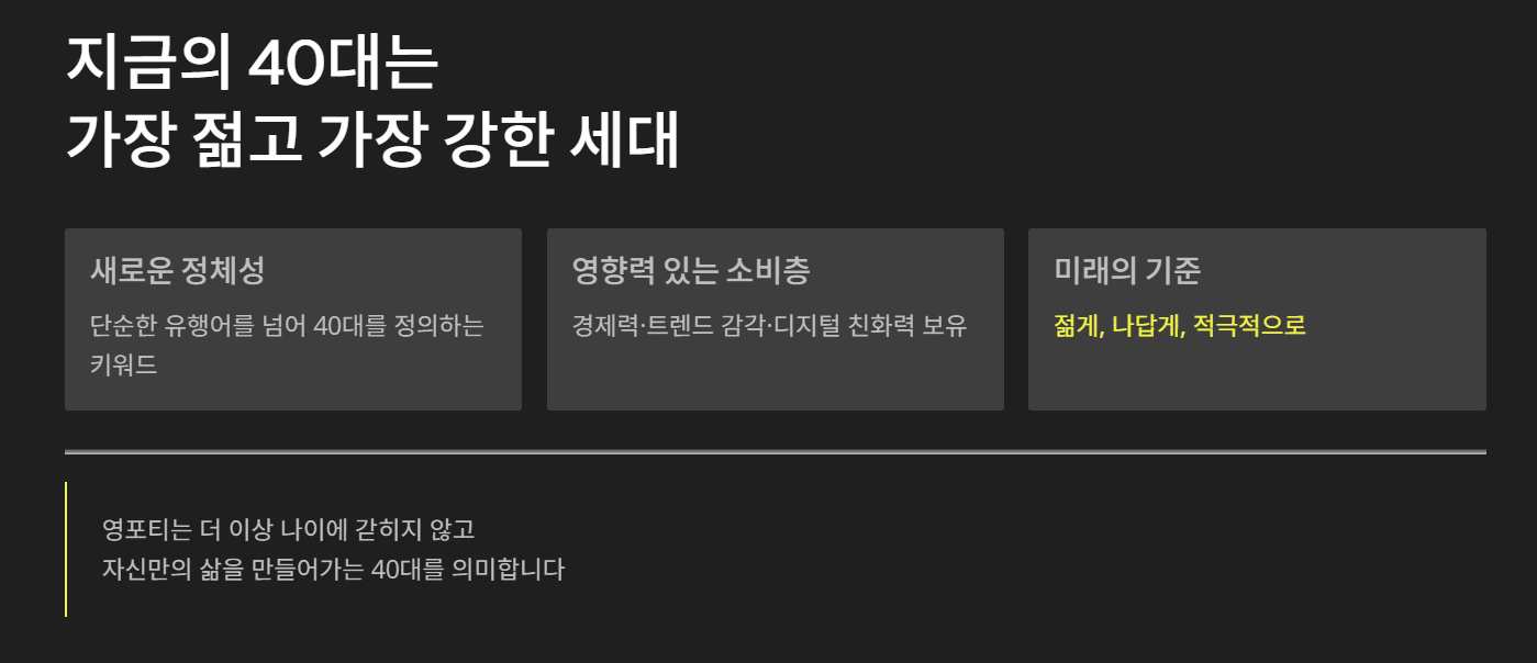 - 영포티는 단순한 유행어가 아니라, 현대 40대를 정의하는 새로운 정체성입니다.