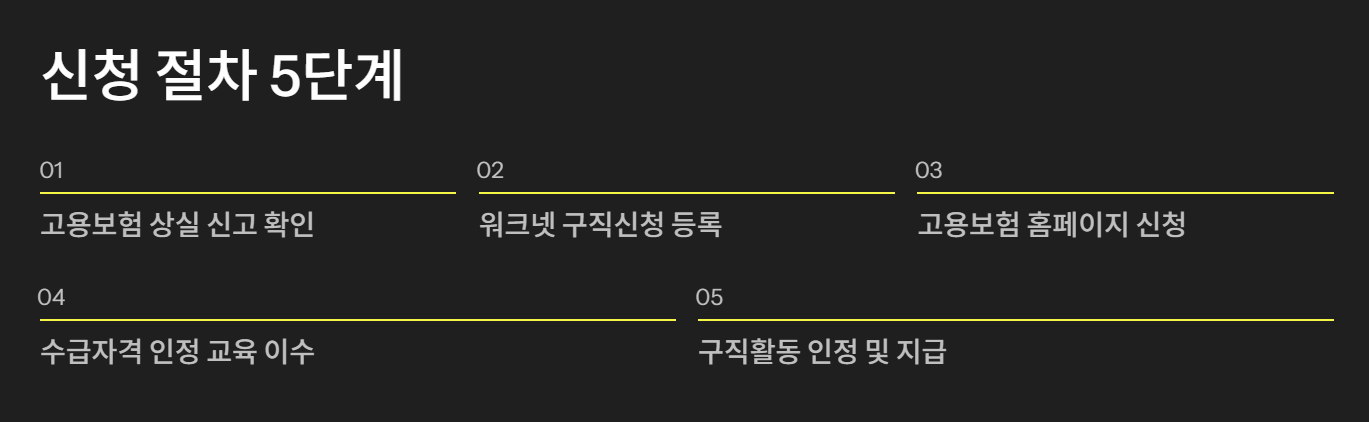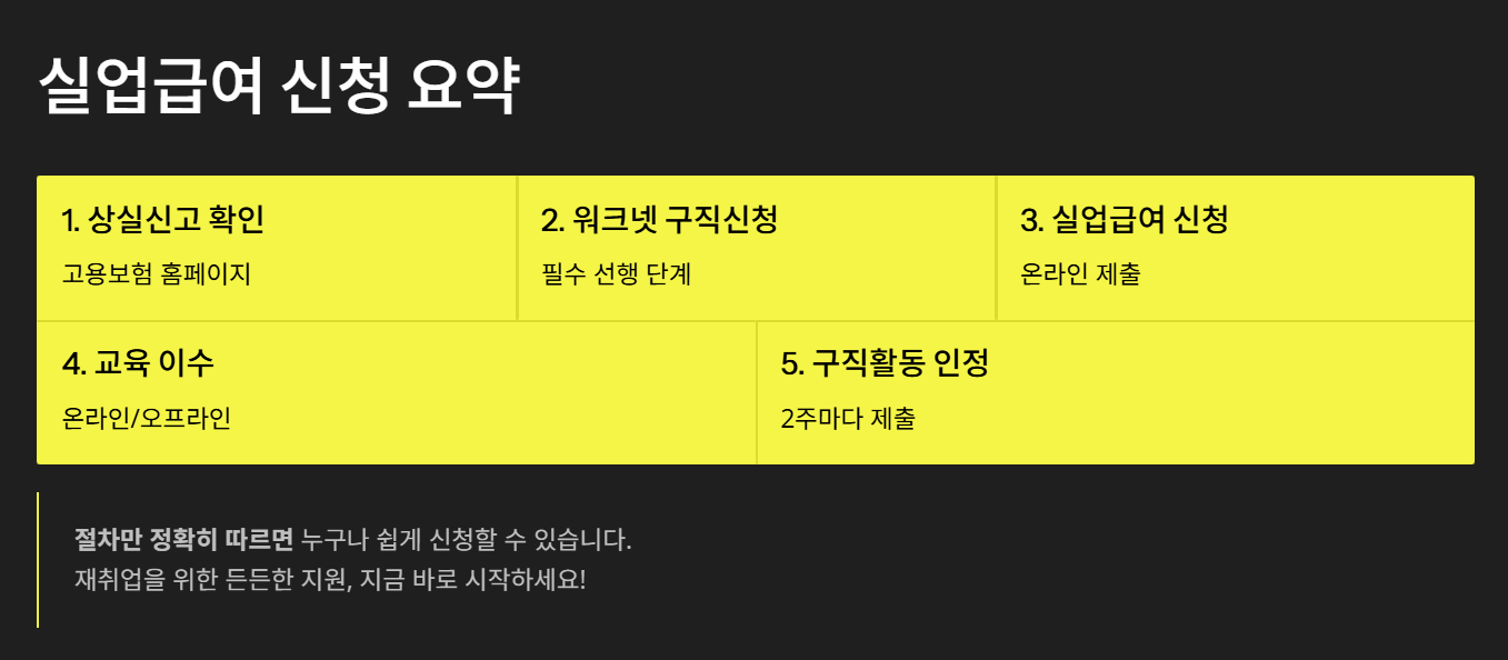 실업급여 신청방법은 퇴사 후 워크넷 구직신청 → 고용보험 홈페이지 신청 → 교육 이수 → 구직활동 인정의 순서로 진행됩니다.