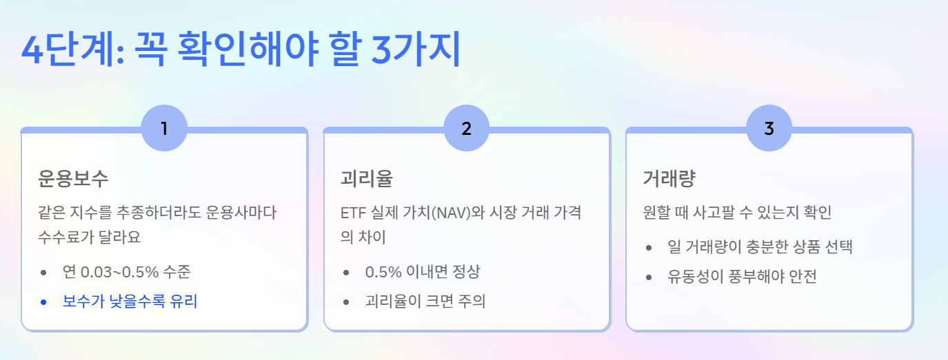 - 괴리율 체크: ETF의 실제 가치(NAV)와 시장에서 거래되는 가격의 차이가 크지 않은지 확인하세요. (보통 0.5% 이내면 정상)