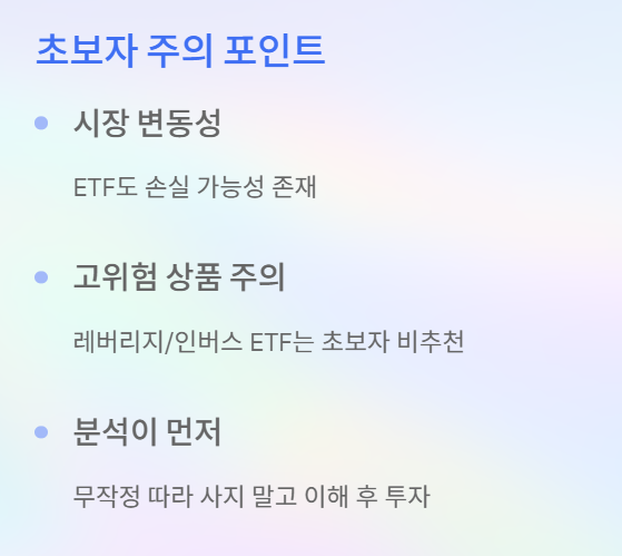 ETF는 안전해 보이지만, 시장 상황에 따라 손실이 발생할 수 있습니다. 특히 레버리지 ETF, 인버스 ETF는 고위험이기 때문에 초보자는 주의가 필요합니다. ETF를 무작정 따라 사기보다는 ETF에 대한 이해와 ETF 종목 분석이 중요합니다.