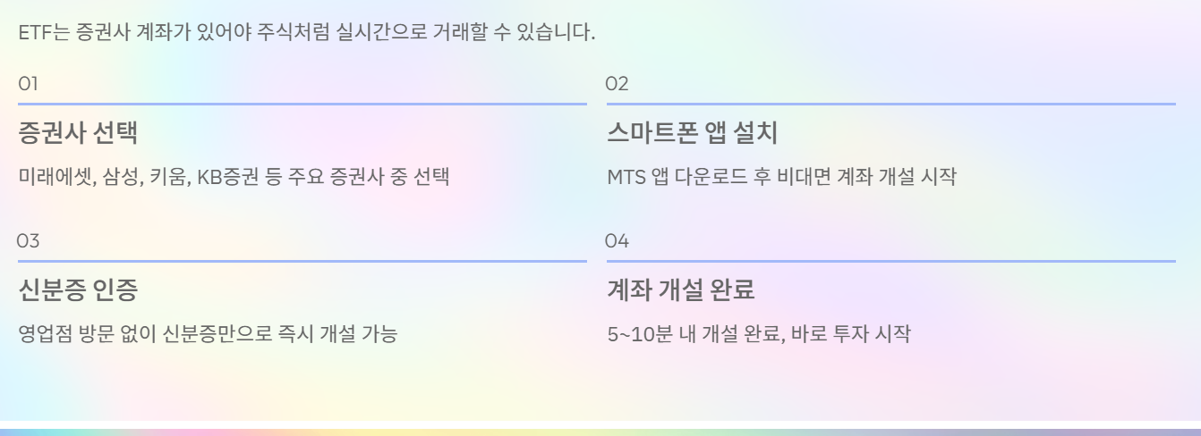 ETF 투자를 시작하려면 먼저 증권사(예: 키움, 미래에셋, NH투자증권 등)에서 계좌를 개설해야 합니다.