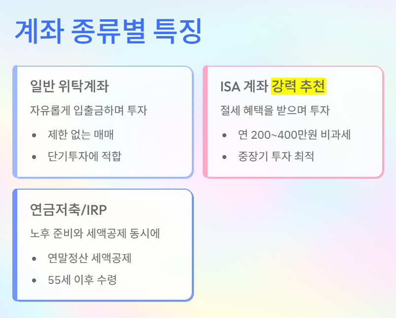 계좌 종류 선택: * 일반 위탁계좌: 자유롭게 입출금하며 투자하고 싶을 때 사용.