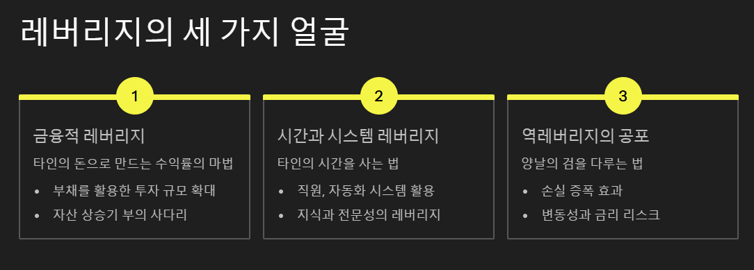 레버리지는 단순히 '빚을 내는 것'에 그치지 않습니다. 현대 자본주의에서 레버리지는 크게 세 가지 관점에서 이해해야 합니다.