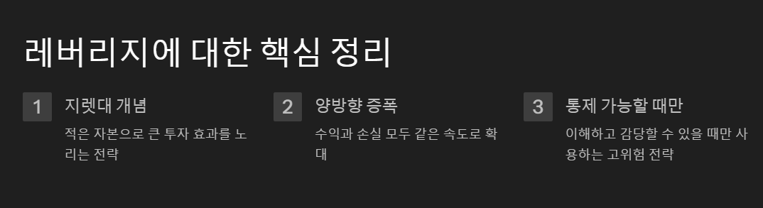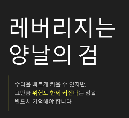 - 레버리지 뜻은 이해하고 통제할 수 있을 때만 사용해야 하는 고위험 전략입니다.