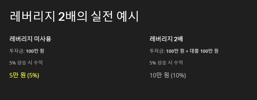 주가가 5% 오를 때 레버리지를 사용하지 않으면 5% 수익이지만, 레버리지를 활용하면 10%, 20%의 수익도 가능해집니다. 이런 구조 때문에 레버리지 뜻은 단기간 수익을 노리는 투자자들에게 특히 매력적으로 보입니다.