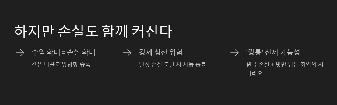 레버리지는 수익을 증폭시키지만, 손실 또한 똑같은 비율로 증폭시킵니다. 이를 **'역레버리지 효과'**라고 합니다.