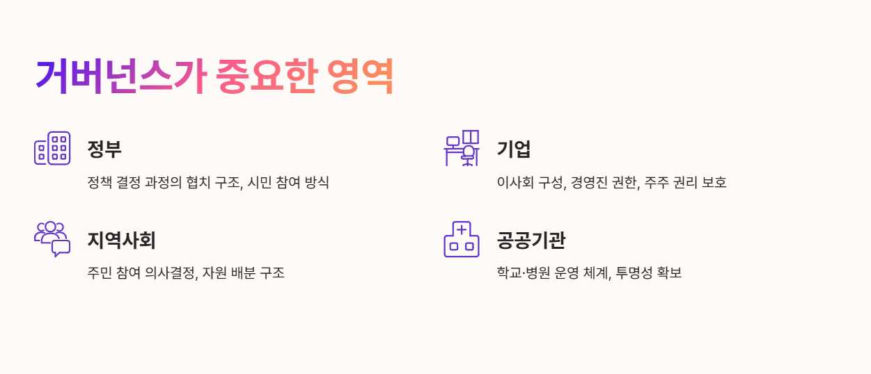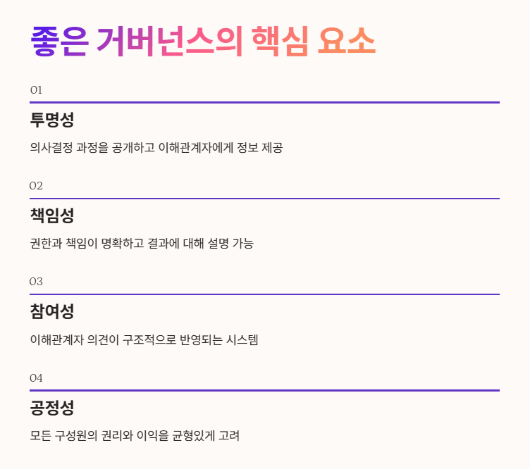 이 모든 영역에서 거버넌스 뜻은 “권력과 책임이 어떻게 분배되는가”를 설명하는 개념으로 사용됩니다. 즉, 거버넌스 뜻은 민주성·투명성·책임성과 밀접하게 연결되어 있습니다.