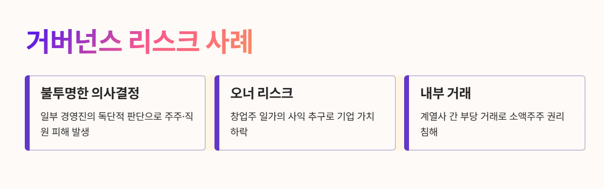 좋은 거버넌스 뜻을 가진 기업은 경영진이 독단적으로 움직이지 않고, 투명한 절차를 통해 의사결정을 합니다. 반대로 거버넌스 뜻이 취약한 기업은 오너 리스크, 내부 거래, 불투명한 의사결정 문제가 반복되기 쉽습니다.
