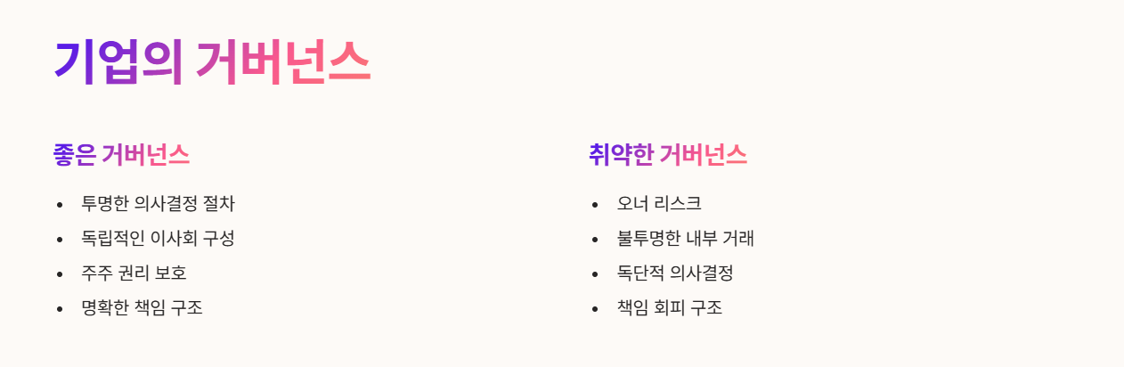 그래서 투자자들은 재무제표뿐 아니라 거버넌스 뜻과 관련된 구조도 중요하게 살펴봅니다.
