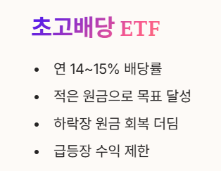 배당률이 14~15%에 달하는 초고배당 월배당 ETF 추천 종목은 적은 원금으로 월 100만 원을 만들 수 있다는 장점이 있습니다. 하지만 이러한 월배당 ETF 추천 상품은 하락장에서 원금 회복이 더딜 수 있다는 점을 반드시 인지해야 합니다. 반면 배당률이 낮은 월배당 ETF 추천 종목은 더 많은 투자금이 필요하지만, 장기적으로 주가 상승에 따른 시세 차익을 기대할 수 있습니다.
