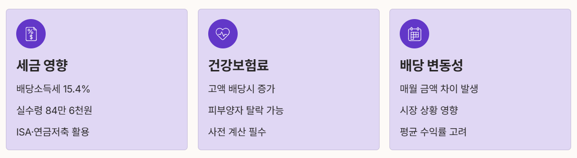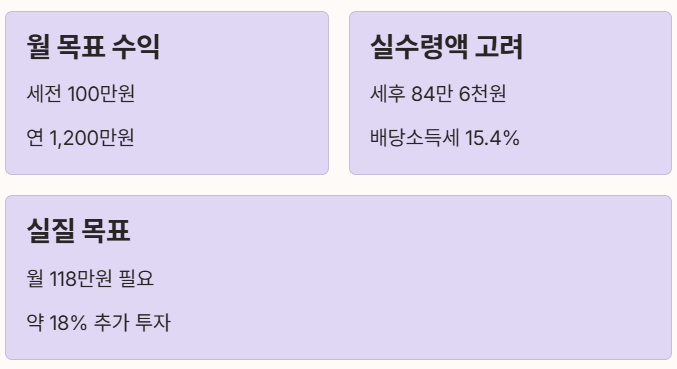 월 100만 원, 즉 연 1,200만 원의 배당을 월배당 ETF 추천 종목으로부터 받게 되면 배당소득세(15.4%)가 발생합니다. 일반 계좌에서 월배당 ETF 추천 투자를 할 경우 실제 수령액은 약 84만 6천 원 수준으로 줄어듭니다. 따라서 실수령액 100만 원을 맞추려면 위 표의 투자금보다 약 18% 정도 더 많은 월배당 ETF 추천 자산이 필요합니다.