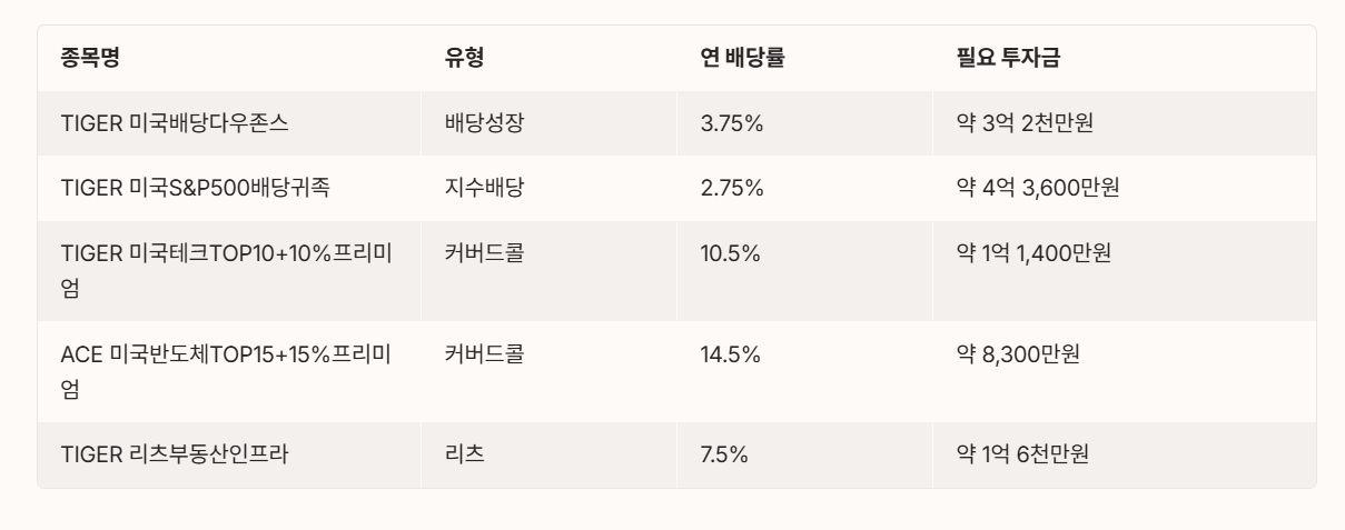 | 유형 | 월배당 ETF 추천 종목명 | 연 배당률(평균) | 월 100만 원 필요 투자금 |