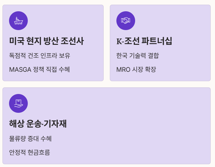 미국 조선업 투자는 크게 '미국 현지 방산 조선사'와 'K-조선과의 파트너십 기업', 그리고 '해상 운송 및 기자재 기업'으로 나뉩니다.