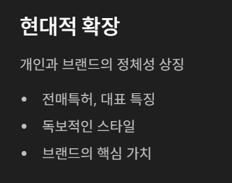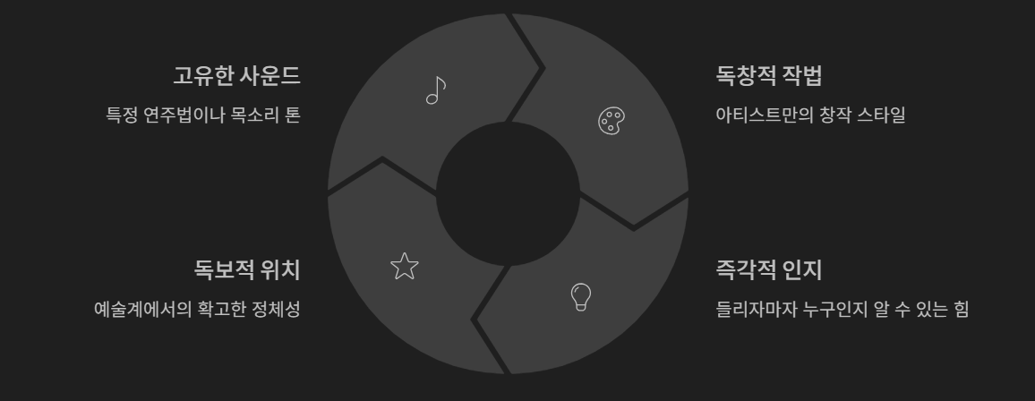 | 음악/예술 | 시그니처 사운드 | 아티스트만의 독특하고 고유한 연주/작법 스타일 |