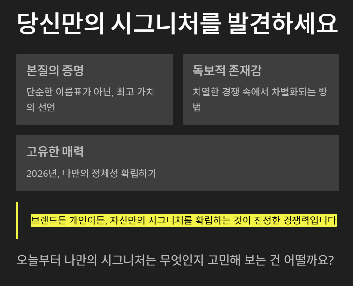 - 차별성: 남들과 다른 나만의 독창성이 담겨 있을 때 시그니처 뜻이 성립됩니다.