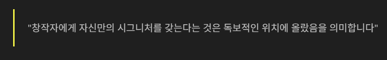 예술가들에게 시그니처 뜻은 자신만의 고유한 인장과 같습니다. 특정 연주법이나 목소리 톤이 들리자마자 누구인지 알 수 있다면, 그것이 바로 그 예술가의 시그니처 뜻입니다. 창작자에게 자신만의 시그니처 뜻을 갖는다는 것은 독보적인 위치에 올랐음을 의미합니다.