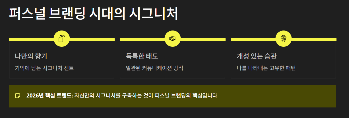 이제 시그니처 뜻은 대중적인 브랜드뿐만 아니라 개인의 삶에도 적용됩니다. 나를 가장 잘 나타내는 향기, 태도, 습관 등을 '시그니처'라고 부르며 자신만의 개성을 표현하는 시그니처 뜻으로 활용합니다. 2026년 현재는 자신만의 시그니처 뜻을 구축하는 것이 퍼스널 브랜딩의 핵심입니다.