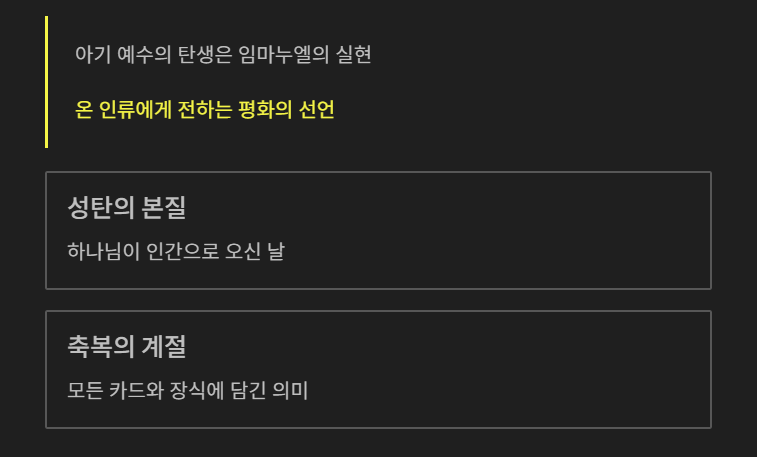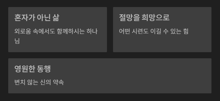 | Immanuel | 하나님이 우리와 함께 계시다 | 고난 속에서도 버리지 않으시는 신의 사랑 |