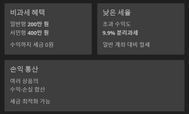 - ✔ 초과 수익도 9.9% 분리과세 (일반 계좌 대비 세율 낮음)